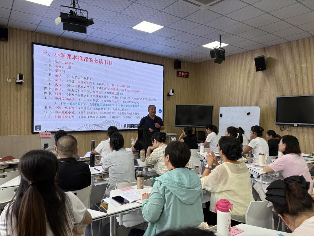 张主任以深厚的教育理论功底和丰富的一线实践经验,为在场教师带来满满“干货”。他先从教育需求与学生发展的角度,深入剖析“为何要重视整本书阅读”,让学员们对这项教学工作的意义有了更深刻的认知。随后,他条理清晰地讲解了整本书阅读的8个目标、8个实施环节及核心策略,还针对小学各学段的特点,明确了不同年级的阅读总要求与必读书目分类,每一项内容都紧扣教学实际,具有极强的指导性。