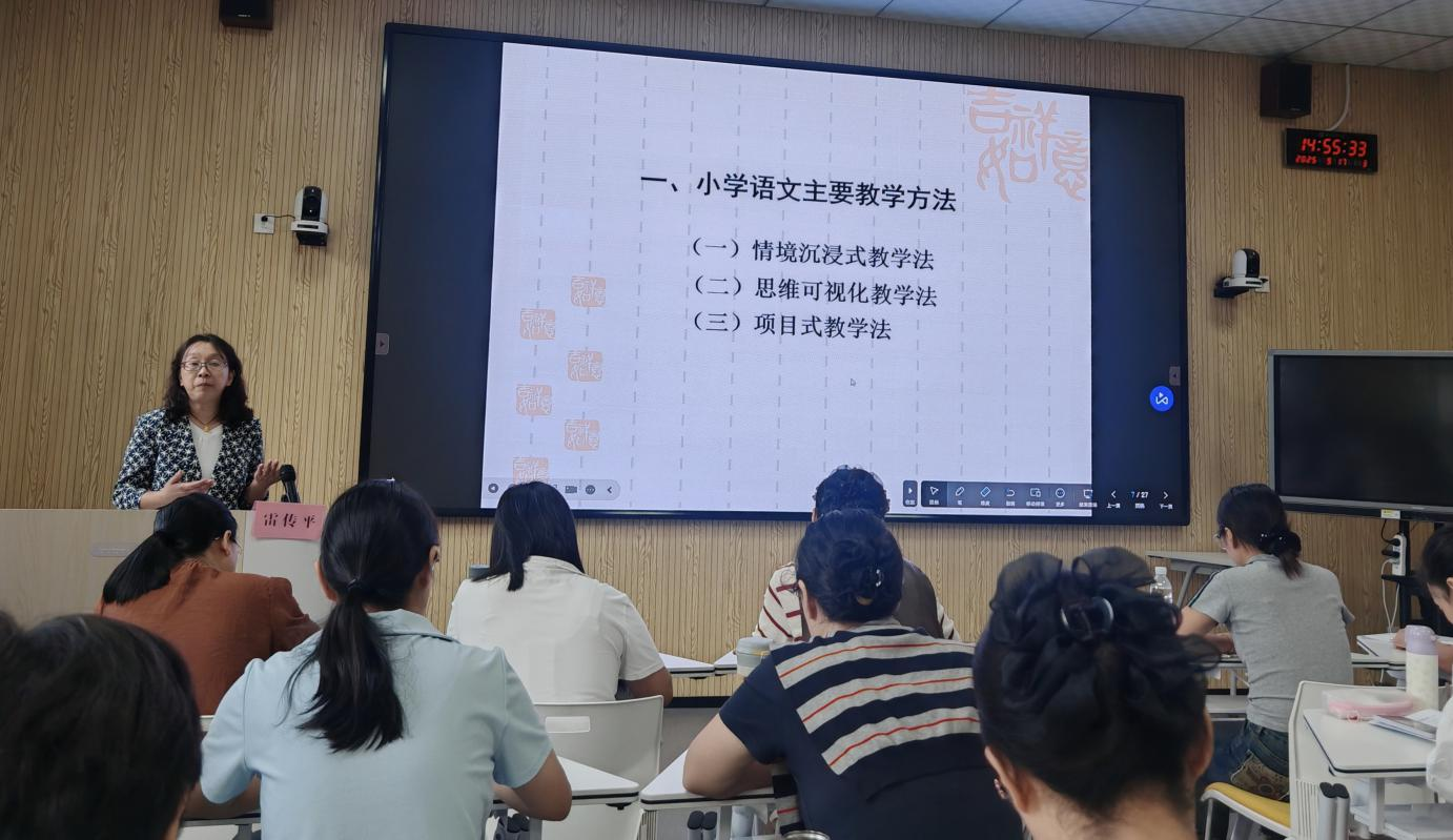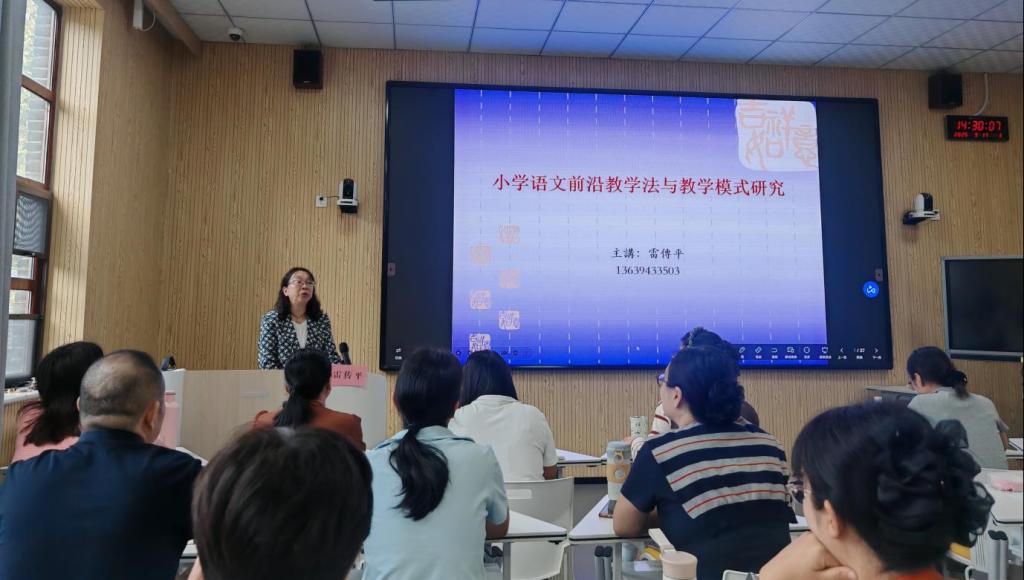 雷传平教授从孔子的“己所不欲,勿施于人”聊起,告诉我们要学思并重。接着雷教授围绕小学语文前沿教学法展开,先深入剖析了三种核心教学方法:情景沉浸式教学法,其核心理念是让学生“身临其境学语文”;思维可视化教学法,以“让思维看得见”为核心,通过思维导图、结构图等形式呈现思考过程,操作模式清晰且易上手;项目式教学法核心是让学生围绕一个具体语文相关项目,通过分组合作、自主探究来完成任务,最终在“做”的过程中提升语文素养。