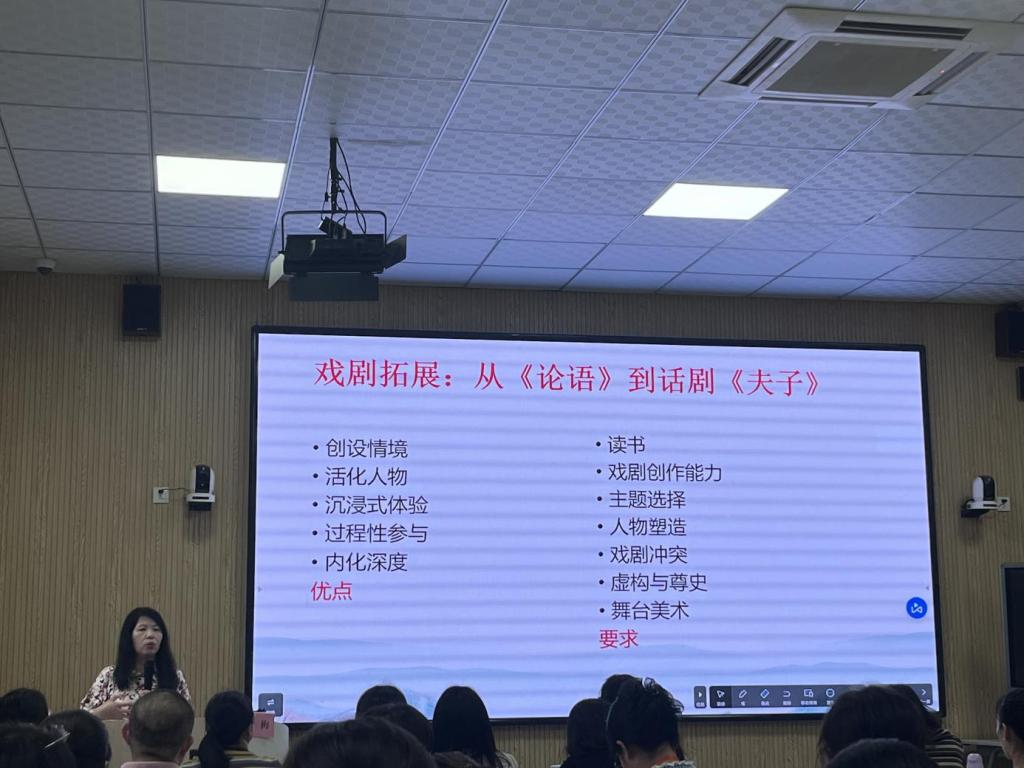袁梅教授围绕优秀传统文化教育展开多维度深度研讨。从梳理2013年至今国家政策导向与教育发展历程,明确语文教师作为文化传承主力军的使命,到剖析当前教学中存在的功利化、形式化、复古化等困境;从提出“守正创新”“美育+”等核心理念,构建“课程化、校本化、现代化”的转化路径,到分享孔子文化融入全科教学、班级电台诵读经典、戏剧演绎《论语》等鲜活案例,每一项内容都紧扣教学实际,为教师提供了可借鉴、可操作的实践方案。尤其在小学语文教学融合层面,明确“培养文质彬彬的君子”的目标,提炼“以美育人、乐学无痕”等十大融合原则,以学校的实践为例,展现了传统文化与语文课堂共生共荣的生动图景。