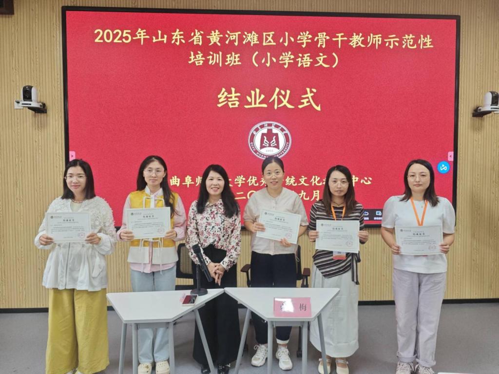 结营仪式的核心环节,是为完成全部培训课程、达到结业标准的学员颁发合格证书。袁梅教授亲自为学员代表颁发结业证书,各小组组长依次上前,双手接过承载着5天学习成果的证书,镜头定格下他们手持证书、面带笑意的瞬间——这一张张证书,不仅是对教师们认真参训的认可,更是对他们未来将传统文化融入语文课堂的期许。