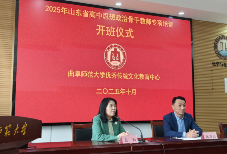 开班仪式上,主办方代表、曲阜师范大学优秀传统文化教育中心(教育培训中心)沈秀清主任首先致辞。他对50名参训骨干教师的到来表示热烈欢迎,同时向长期支持高中思政教师队伍建设的山东省教育厅表达诚挚感谢。在介绍曲阜师范大学办学特色时,沈主任重点提及学校在思政教育领域的深厚积淀与实践成果,让学员们对培训承办方的专业实力有了清晰认知。随后,他详细解读了本次培训的“理论+实践”双轨模式,同时明确课程安排与学习要求,并强调本次培训的核心意义:“旨在助力思政教师夯实专业基础、创新教学方法,更好承担起‘立德树人’的思政育人使命。”