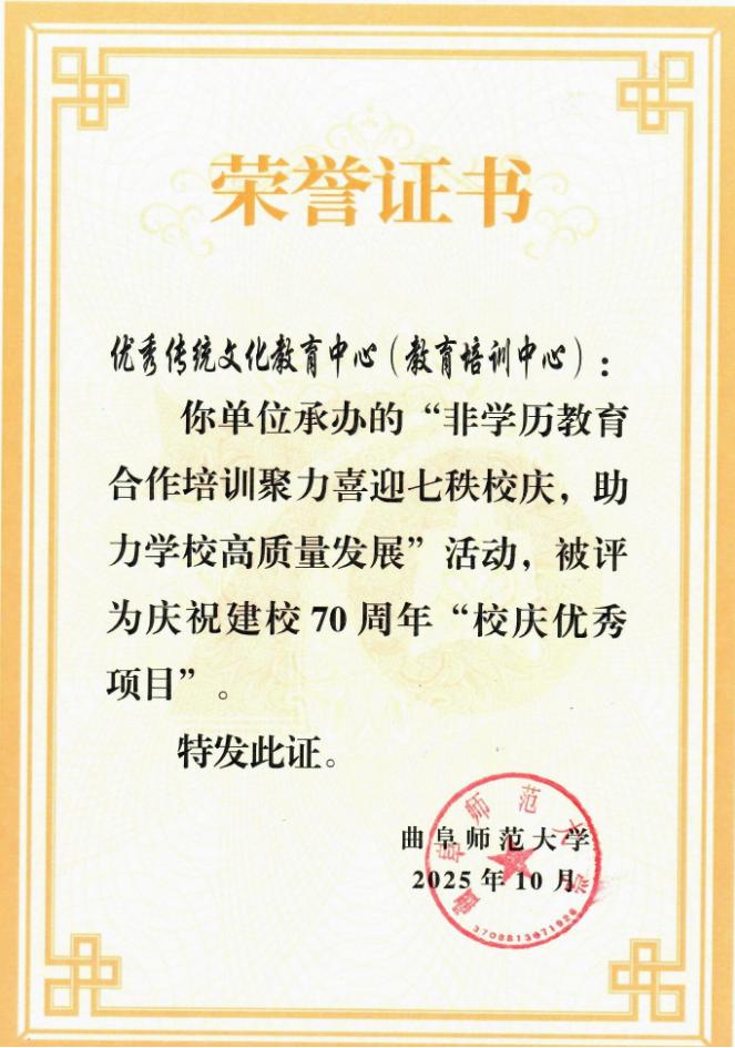 优秀传统文化教育中心(教育培训中心)荣获建校70周年“校庆优秀项目”荣誉